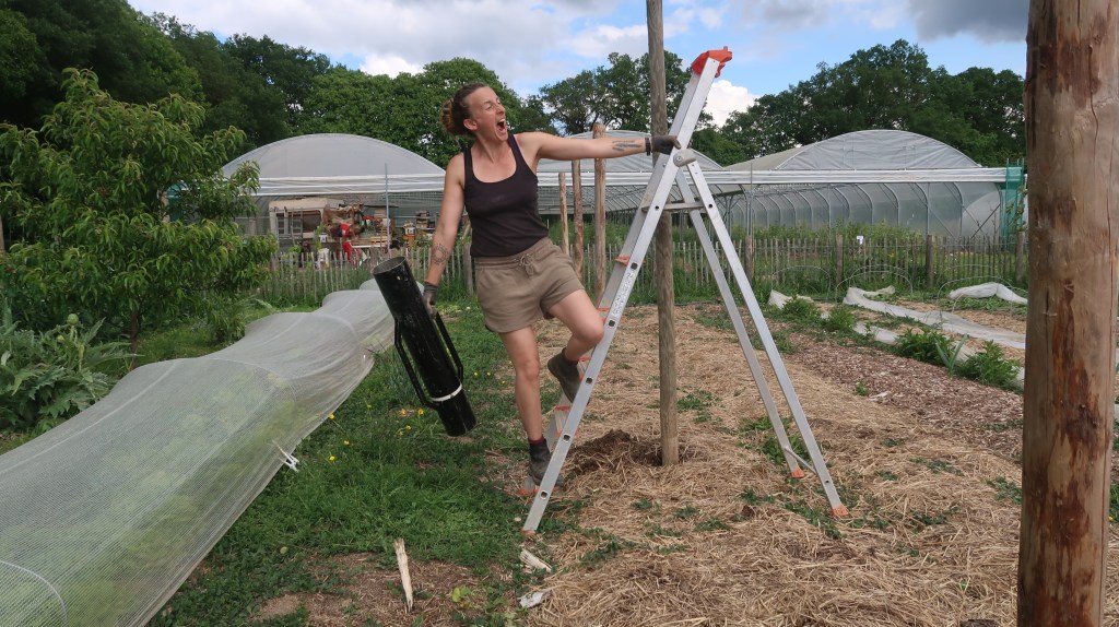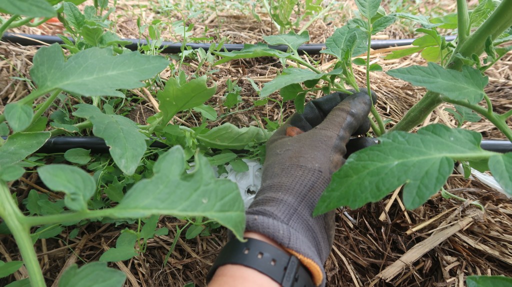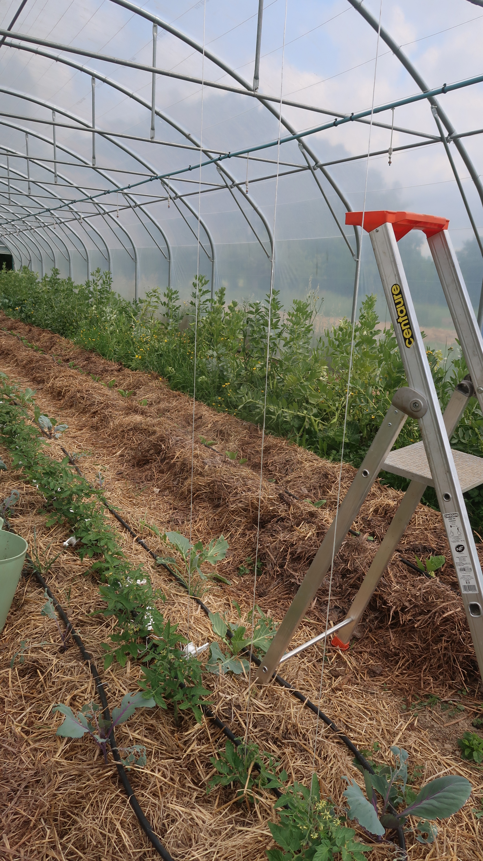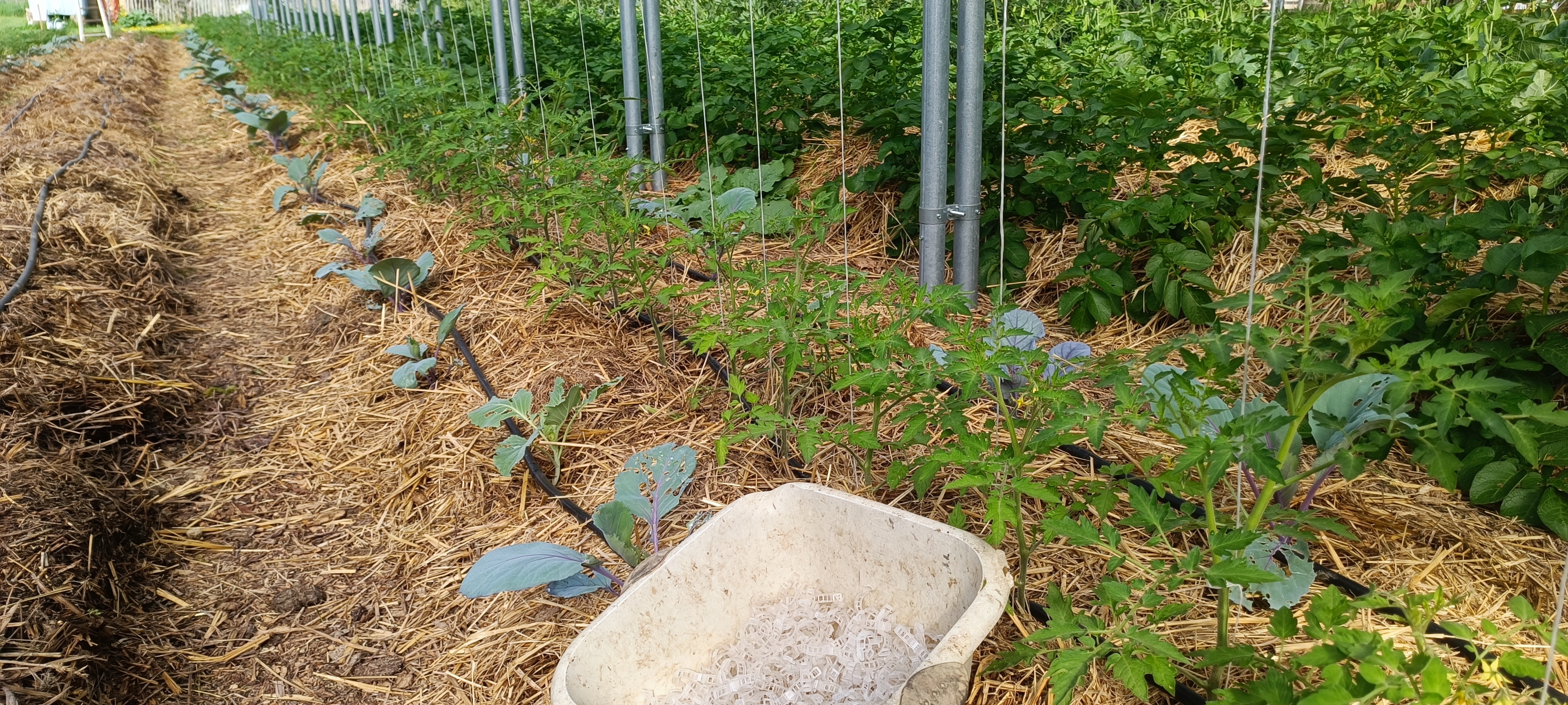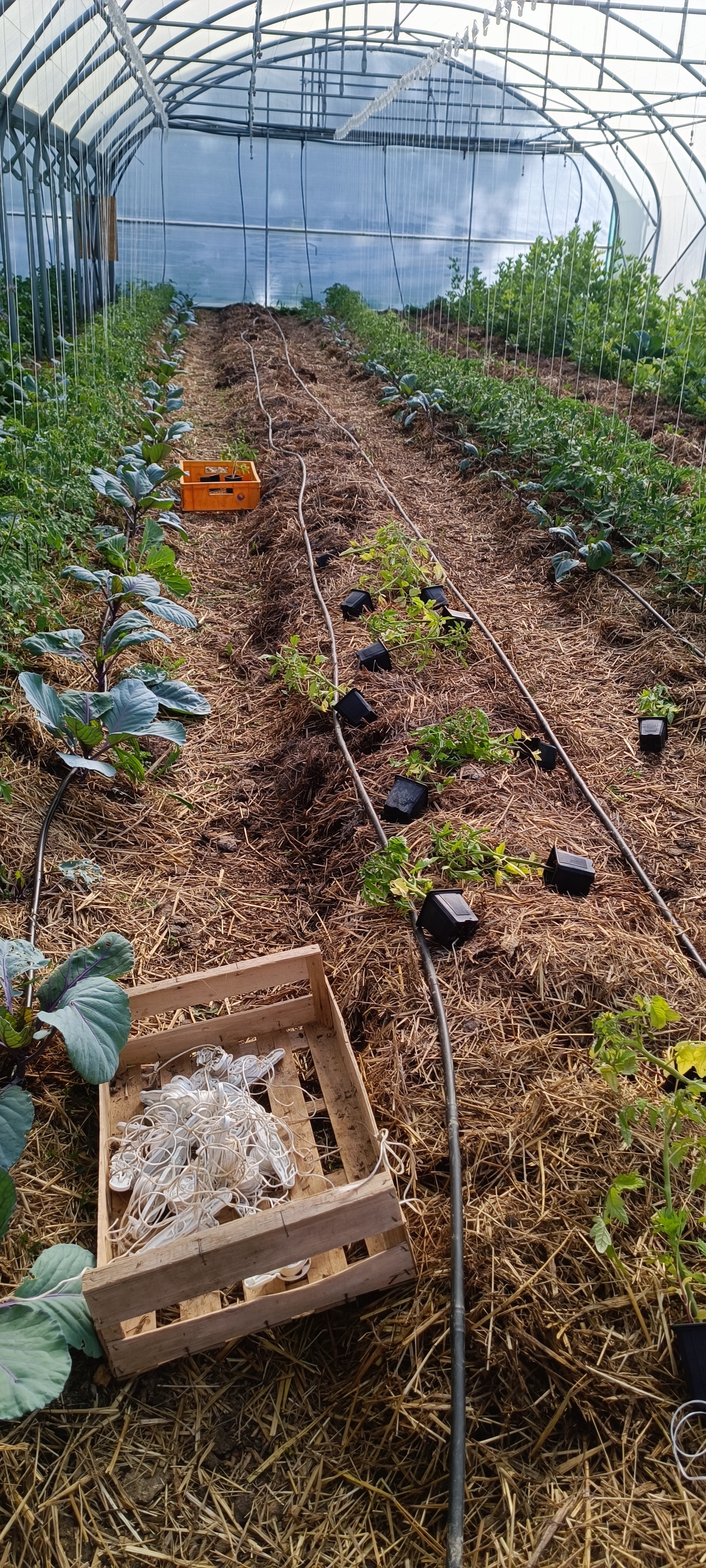 Début mai commence avec le soin aux tomates 🍅. Cette culture est à entretenir souvent. Le palissage, comme on l’appelle, consiste à faire grimper correctement la tomate le long d’un support et d’enlever les gourmands des tomates. Cette opération est délicate car il arrive qu’une tête soit cassée par erreur ! 😬 J’ai également planté ma deuxième série de tomates 🌱. À chaque passage sur une culture, le désherbage va avec 🧑🌾. Je consacre 1 heure par jour de désherbage ⏳. Cette tâche fait partie du métier.