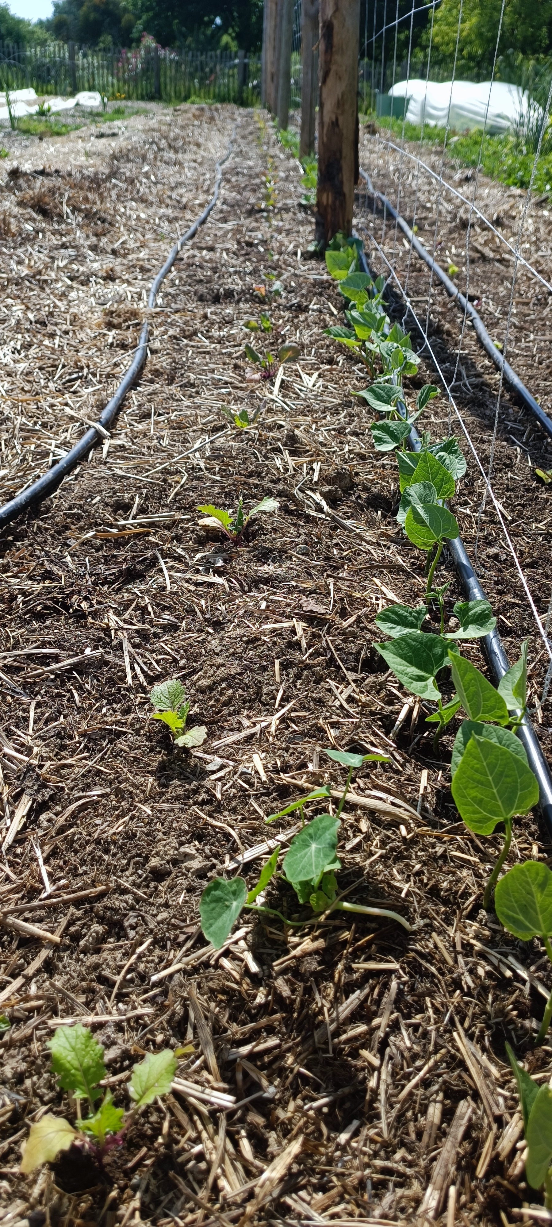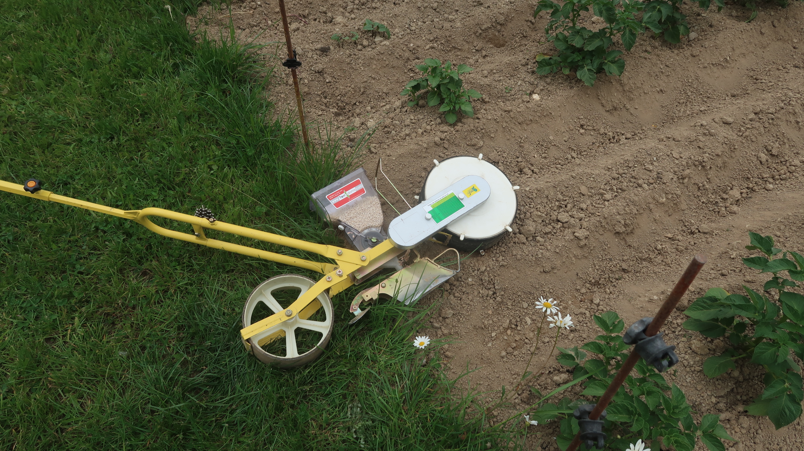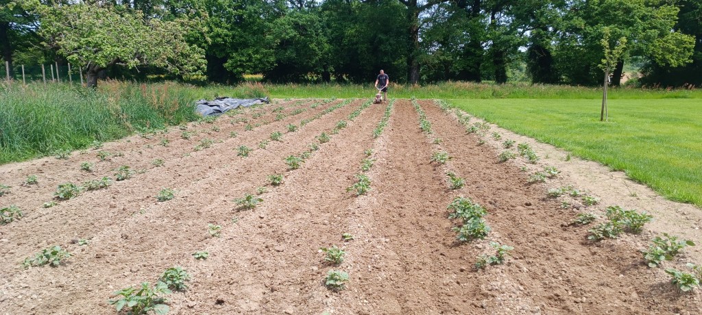 Les pommes de terre profitent bien de ce soleil ☀️ et cette pluie 🌧️ de Mai. Un temps idéal pour que tous nos légumes poussent à merveilles 🌱. Comme les pommes de terre ont été plantées avec le tracteur 🚜. Les rangs sont très espacés. J’ai donc profité des inter rangs pour y semer des haricots verts. Avant cela, on passe un petit coup de motoculteur, on butte les patates et hop le semoir fait le travail.